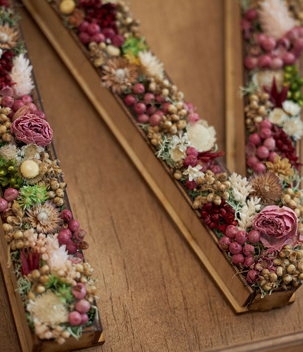 Composición de letra en flor natural preservada, especiales y únicas. Medida de la caja: 30×30 cm.