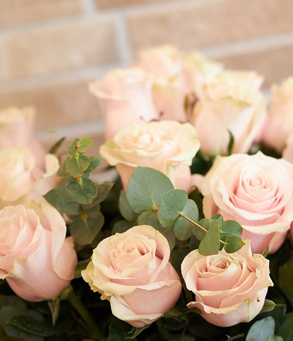 Ramo de tallos largos de rosas rosas, seleccionadas cuidadosamente por nuestros floristas, con verdes frescos de temporada.
